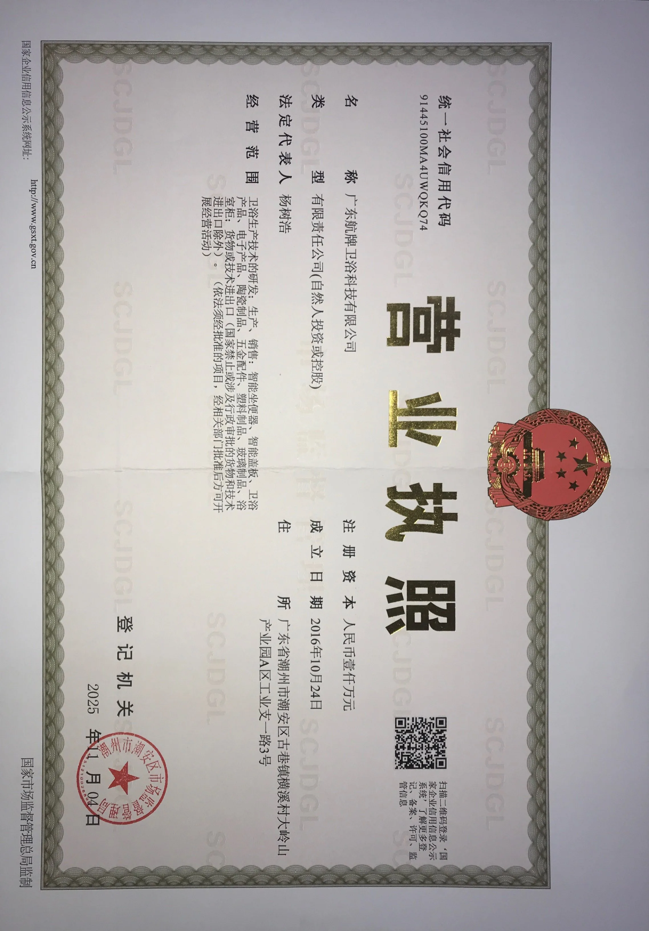 Registered address : No. 3, Industrial Branch Road 1, Area A, Daling Mountain Industrial Park, Hengxi Village, Guxiang Town Chaozhou City Guangdong Province China